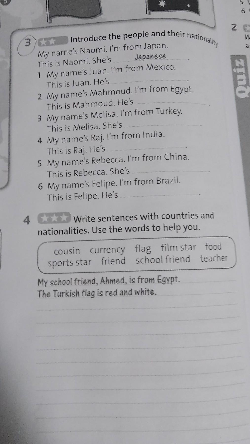 4 The film star, Ahmed, is from Egypt. The Egyptian flag is red, white and black.
