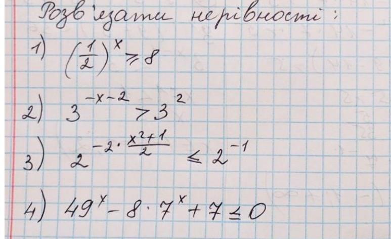 1) (1/2)ᵡ ≥ 8 ⇒2⁻ᵡ ≥ 2³ ⇒ -х ≥ 3 ⇒ х ≤ -3 ⇒ х ∈ (-∞; -3];