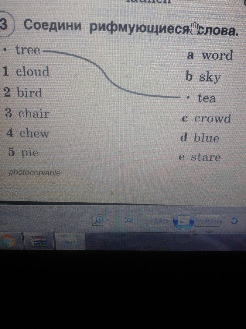 Нужна помощь с задачей по соедини рифмующиеся слова например: tree tea 1? Получите подробные решения и обсуждения от других участников для школьников 1 - 4 класс. Ответы на этот вопрос уже добавлены. Мы приглашаем вас задать свой вопрос и стать экспертом для других.