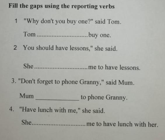 Rewrite the sentences in Reported Speech using the verbs given in brackets 1. «You took my wallet yesterday» Olatz said. (accuse) 2. Roberto said T’II help you tomorrow» (promise) 3. «Why don’t we go to Madrid this weekend?» He said (suggest) 4. «She is always taking my things without permission!» he said (complain) 5. «I will marry you Gemma said (promise) «Pay attention, please» The teacher said to the students (ask) «Aim and shoot the captain said to the soldiers (order) You’d better go to the dentist» Mum said to me (advise) «I didn’t steal the money from the bag» he said (deny) 10. «I’m sorry I didn’t call you before coming» Jon said (apologize) 11. «Stop making that noise or I’ll leave» Lorena said (threaten) 12. «Please, please lend me your car my sister said to me (beg) 13. «Don’t forget to water the plants» mum said to his son (remind) 14. «You must study the irregular verbs the teacher said to her (insist) 15. «Don’t go near the river she said to the children (warn) 16. No, I won’t eat the beans» the child said (refuse) 17. «You should enter in silence’ the teacher said to the students (advise) 18. Rachel said to Rose You tore the book’ (accuse) 19. «Why don’t we dress up for the party? (suggest)
