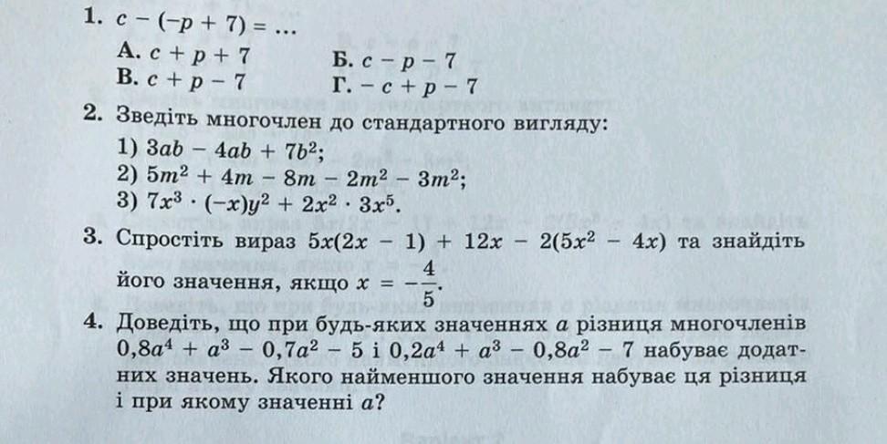 4. (0,8а² + а3 — 0,72 — 5) — (0,2а² +а3 — 0,8а²- 7) = = 0,84 + а3 — 0,7a2-5 — 0,2a4a3 + 0,8а²+7 = 0,6a+ 0,1a2+2