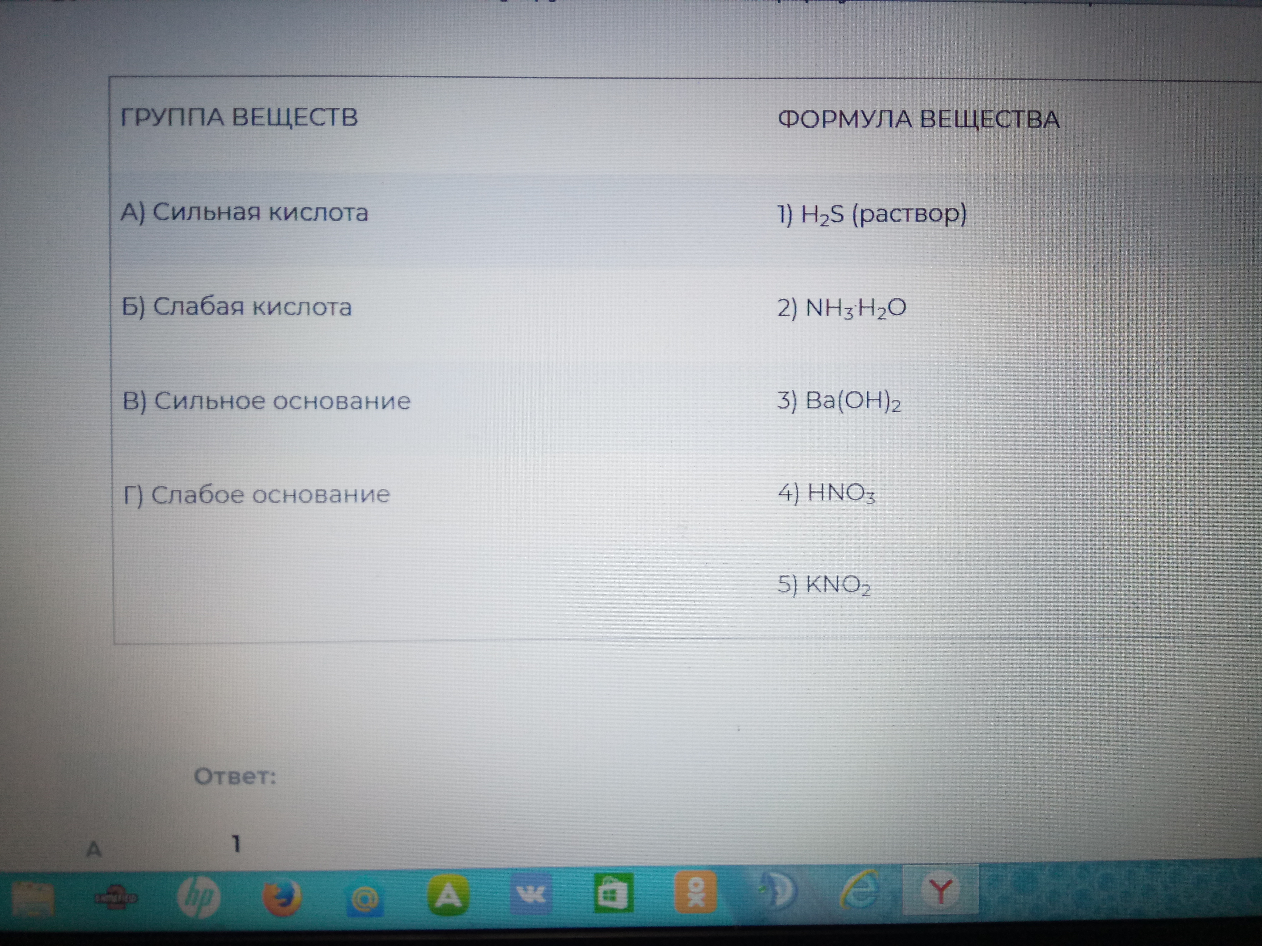 Сильная кислота:HNO3 Сильное основание:Вa(OH)2 Слабая кислота: H2S