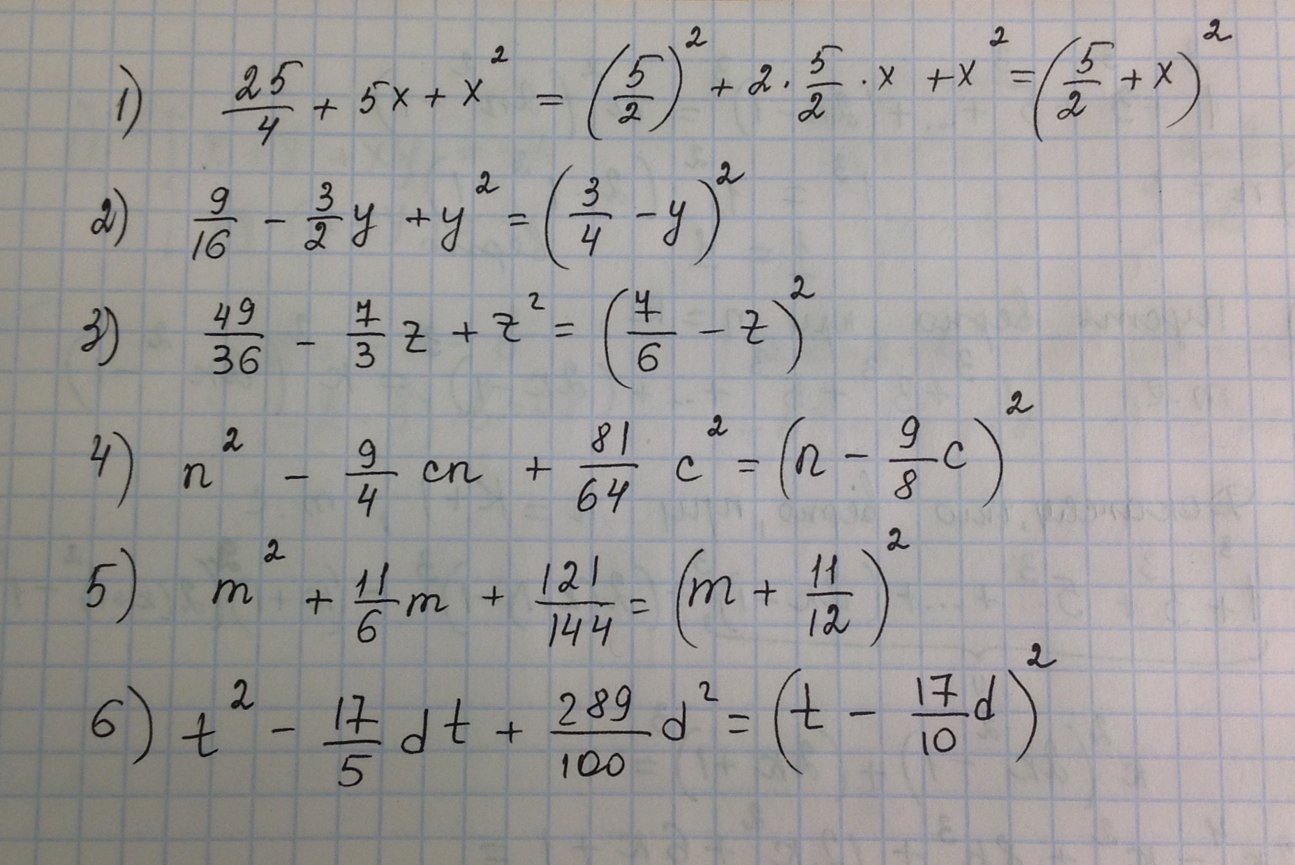 Ищете помощь с задачей по Дам 45 баллов!32.7 Представьте в виде квадрата двухчлена трехчлены 1)25/4+5x+x^2 2)9/16-3/2y+y^2 3)49/36-7/3z+z^2 4)n^2-9/4cn+81/64c^2 5)m^2+11/6m+121/144 6)t^2-17/5dt+289/100d^2? Узнайте, как решить задачу для школьников 5 - 9 класс и читайте обсуждения от других участников. Ответы уже опубликованы. Не забывайте, что вы можете задать свой вопрос или стать экспертом, помогая другим пользователям.