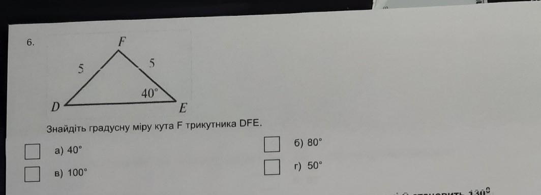 Трикутник рівнобедрений, отже D буде мати 40 градусів. В трикутнику всього 180 градусів, (40+40)-180=100