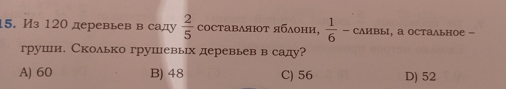 Берем под общий делитель, 2/5 умножаем на 6, а 1/6 умножаем на 5, и плюсуем. выходит 12/30+5/30=17/30 30/30-17-30=13/30. Теперь 120 умножаем на 13 и делим на 30, выходит 52. Ответ D)
