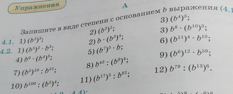 задание 4.1 1) чтобы это сделать там нужно раскрыть скобки, в случае этого примера, мы делаем так: b оставляем, а степень перемножаем. Получается b в 6 степени.