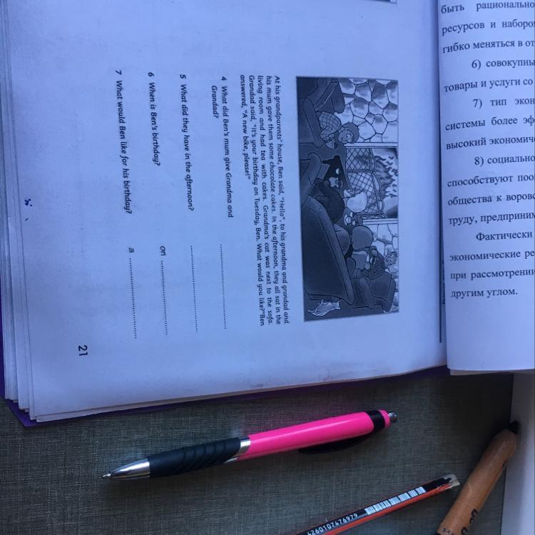At his grandparents’ house, Ben said, *Hello», to his grandma and grandad and his mum gave them some chocolate cakes. In the afternoon, they all say in the living room and had tea with cakes. Grandma’s cat was next to the sofa Grandad said, «It’s your birthday on Tuesday, Ben. What would you like? Ben answered, «A new bike, please!»