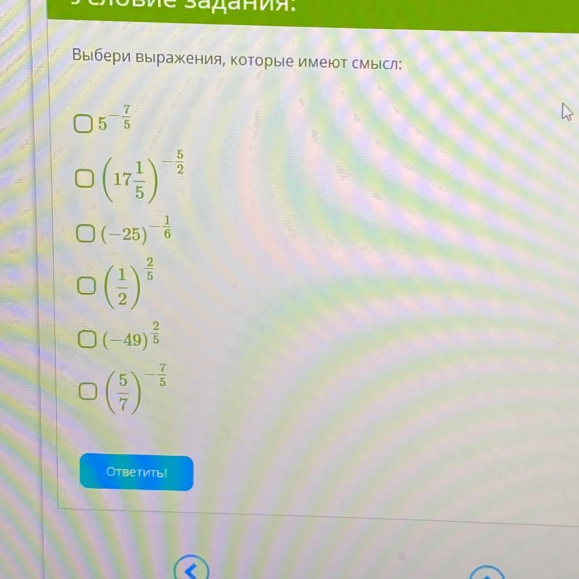 Задача по выбегите выражение, которые имеют смысл. помогите для школьников студенческий? Узнайте решение и получите советы по предмету Алгебра. Прочитайте множественные ответы, чтобы разобраться в теме. Ответы уже доступны. Если у вас есть трудности, не стесняйтесь попросить помощи у экспертов. А также вы можете стать экспертом и помогать другим ученикам!