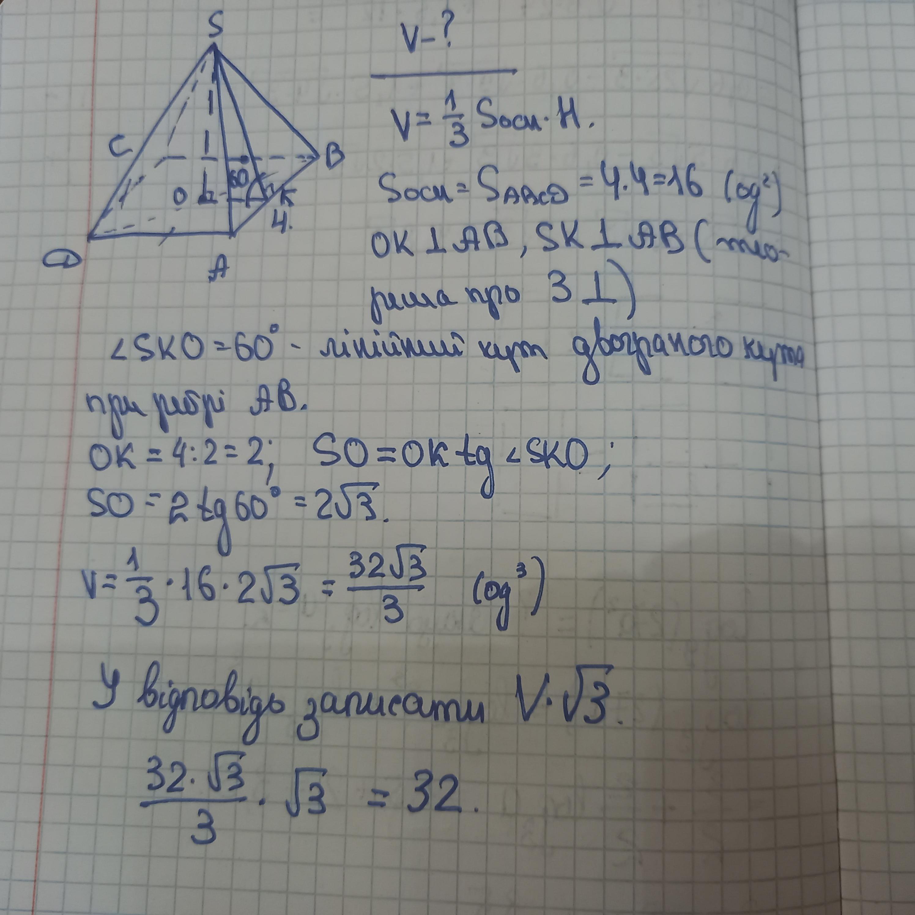 4. Висота правильноï чотирикутної піраміди дорівнює 12