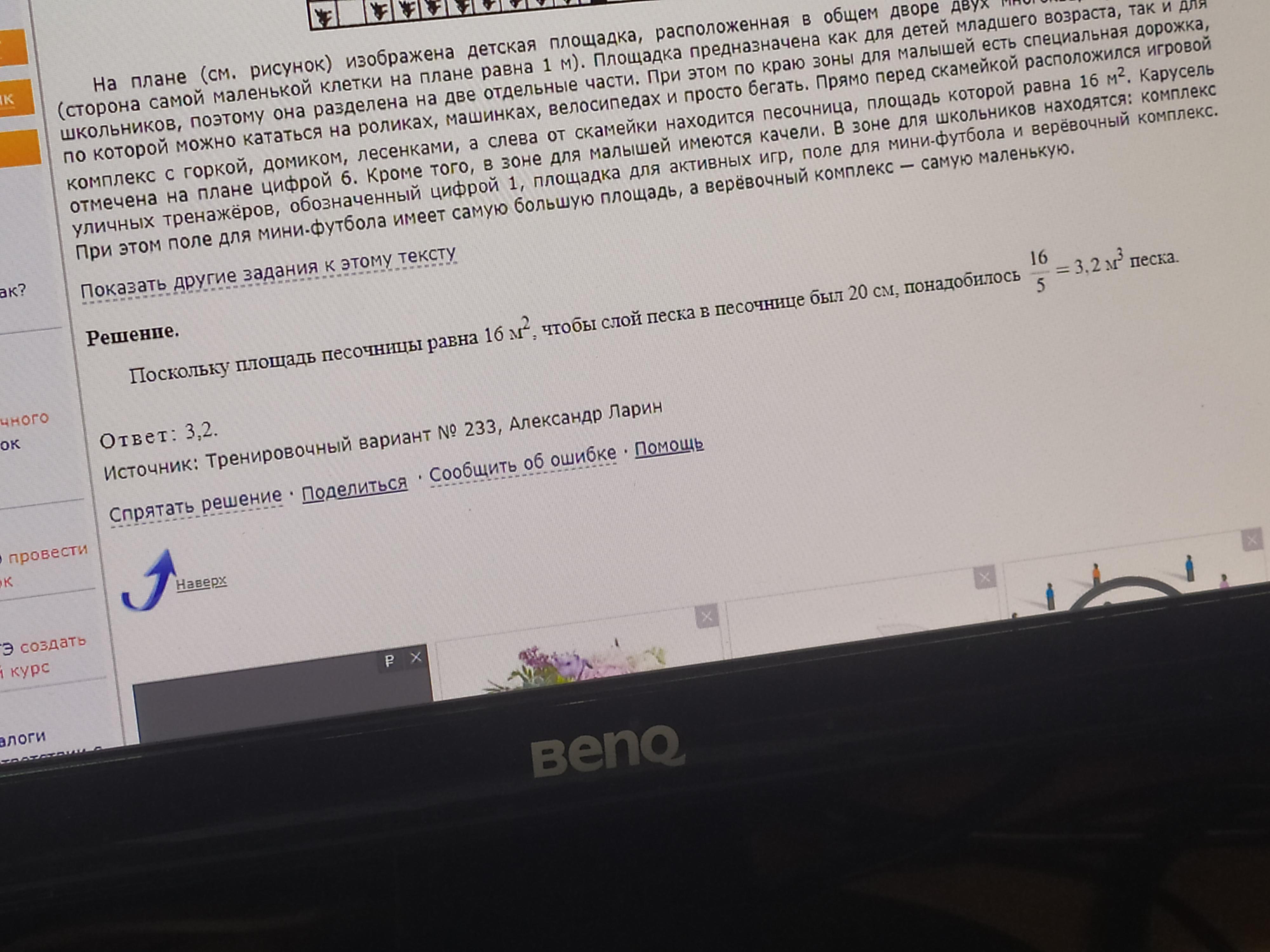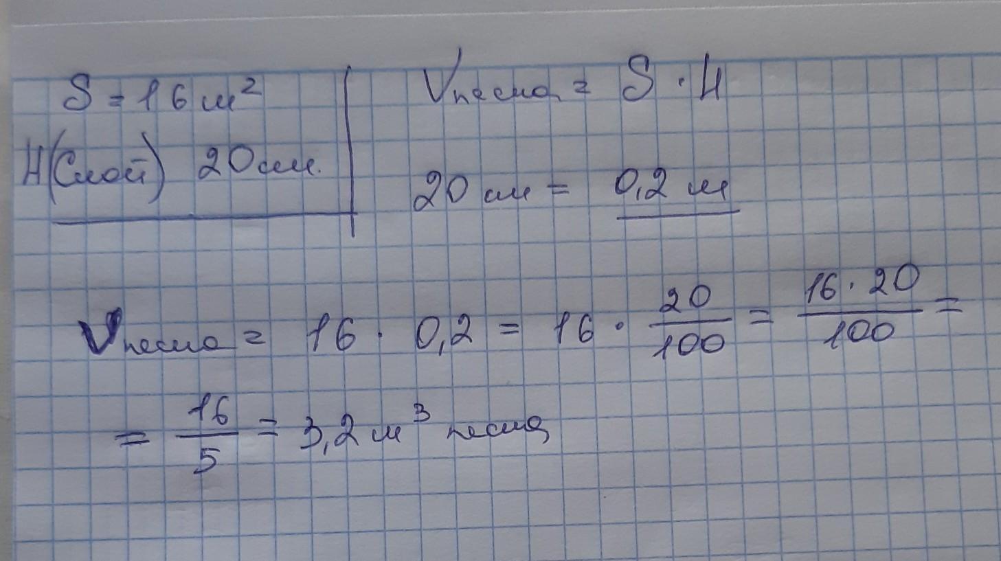 Площадь песочницы в метрах, а слой песка в см. Нужно перевести 20 см в метры. И тогда все будет понятно.