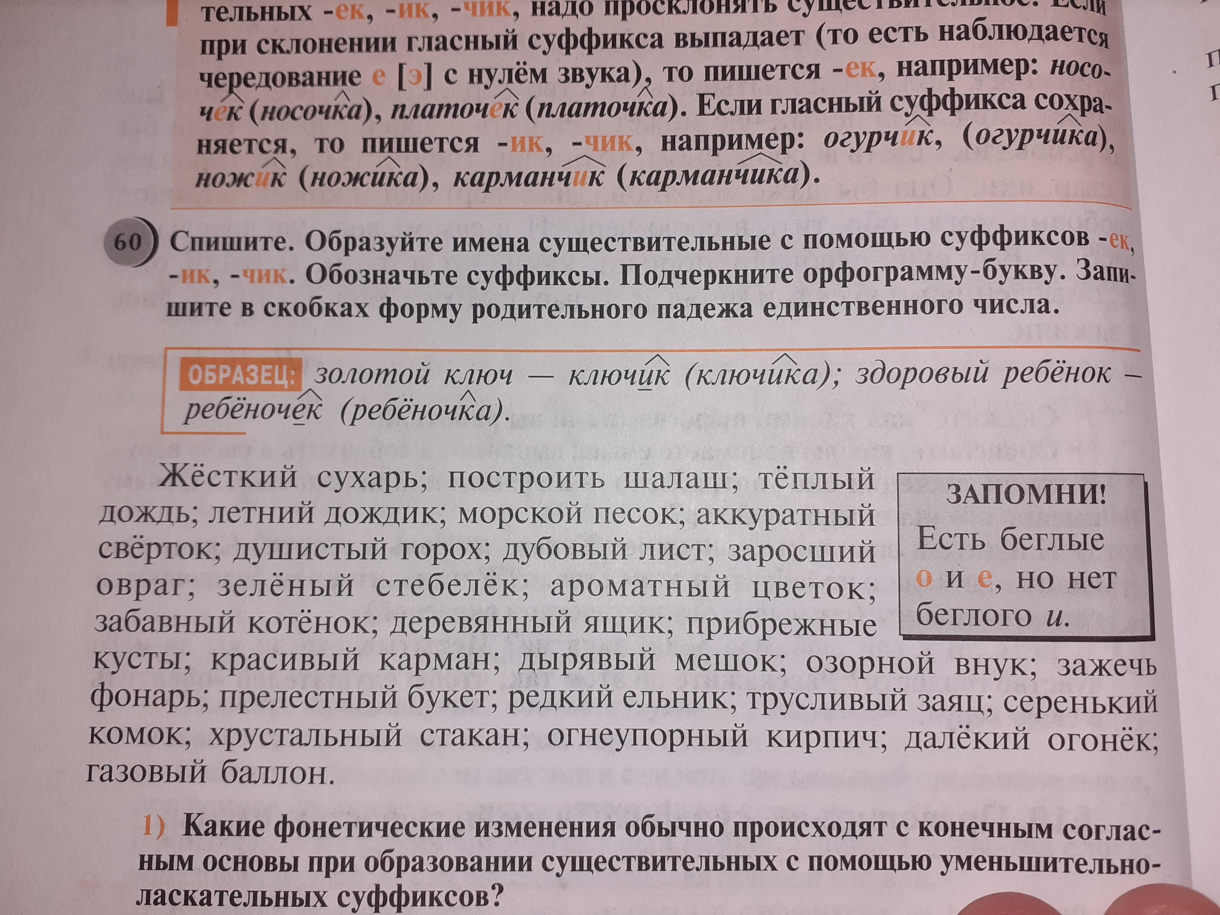 Ответ: жесткий сухарик (сухарика), построить шалашик (шалашика), тёплый дождик (дождика), летний дождичек (дождичка), морской песочек (песочка), аккуратный сверточек (сверточка), душистый горошек (горошка), дубовый листик (листика), заросший овражек (овражека), зелёный стебелечек (стебелечка), ароматный цветочек (цветочка), забавный котёночек (котёночка), деревянный ящичек (ящичка), прибрежные кустики (кустика), красивый кармашек (кармашка), дырявый мешочек (мешочка), озорной внучек (внучка), зажечь фонарик (фонарика), прелестный букетик (букетика), редкий ельничек (ельничка), трусливый зайчик (зайчика), серенький комочек (комочка), хрустальный стаканчик (стаканчика), огнеупорный кирпичик (кирпичика), далёкий огонечек (огонечка), газовый баллончик (баллончика)