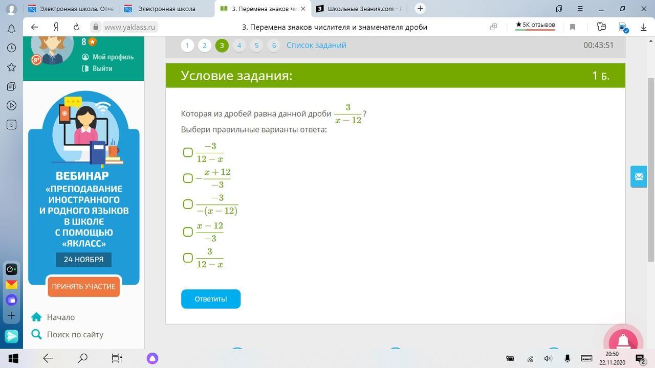 Задача по ХЕЛП МИ!ПРОШУ! Которая из дробей равна данной дроби 3x−12 ? Выбери правильные варианты ответа: −3/12−x −x+12/−3 −3/−(x−12) x−12/−3 3/12−x для школьников 5 - 9 класс? Читайте обсуждения и ответы на тему Математика. Ответы на этот вопрос уже есть. Присоединяйтесь к нам, задавайте вопросы и делитесь своими знаниями с другими участниками.