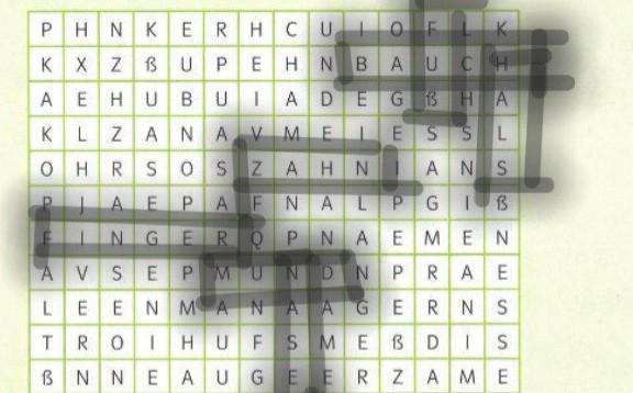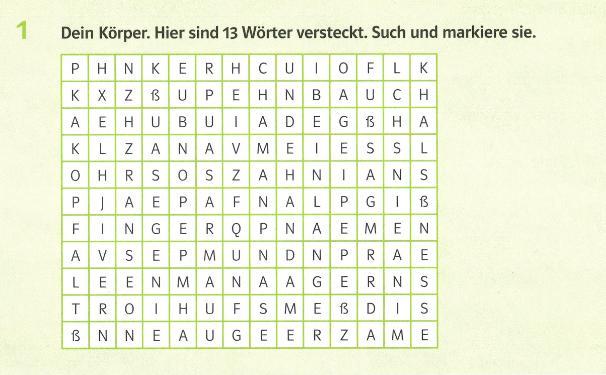 Нашел только 10 слов, связанных с телом (Zahn,Kopf( слева, заканчиваеться в слова Finger), Finger, Mund, Hals, Fuß, Nase, Bein(между слов Bauch и Zahn), Bauch, Hand(Hand получаеться между словами Zahn и Mund)). Находил еще слова, но они не подходят под тему.