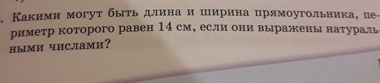 периметр прямоугольника равен 14 сантиметров, длина его двух сторон равна 14 см : 2 = 7 см. При ширине прямоугольника 1 см его длина будет равна 7 см – 1 см = 6 см. При ширине прямоугольника 2 см его длина будет равна 7 см – 2 см = 5 см. При ширине прямоугольника 3 см его длина будет.