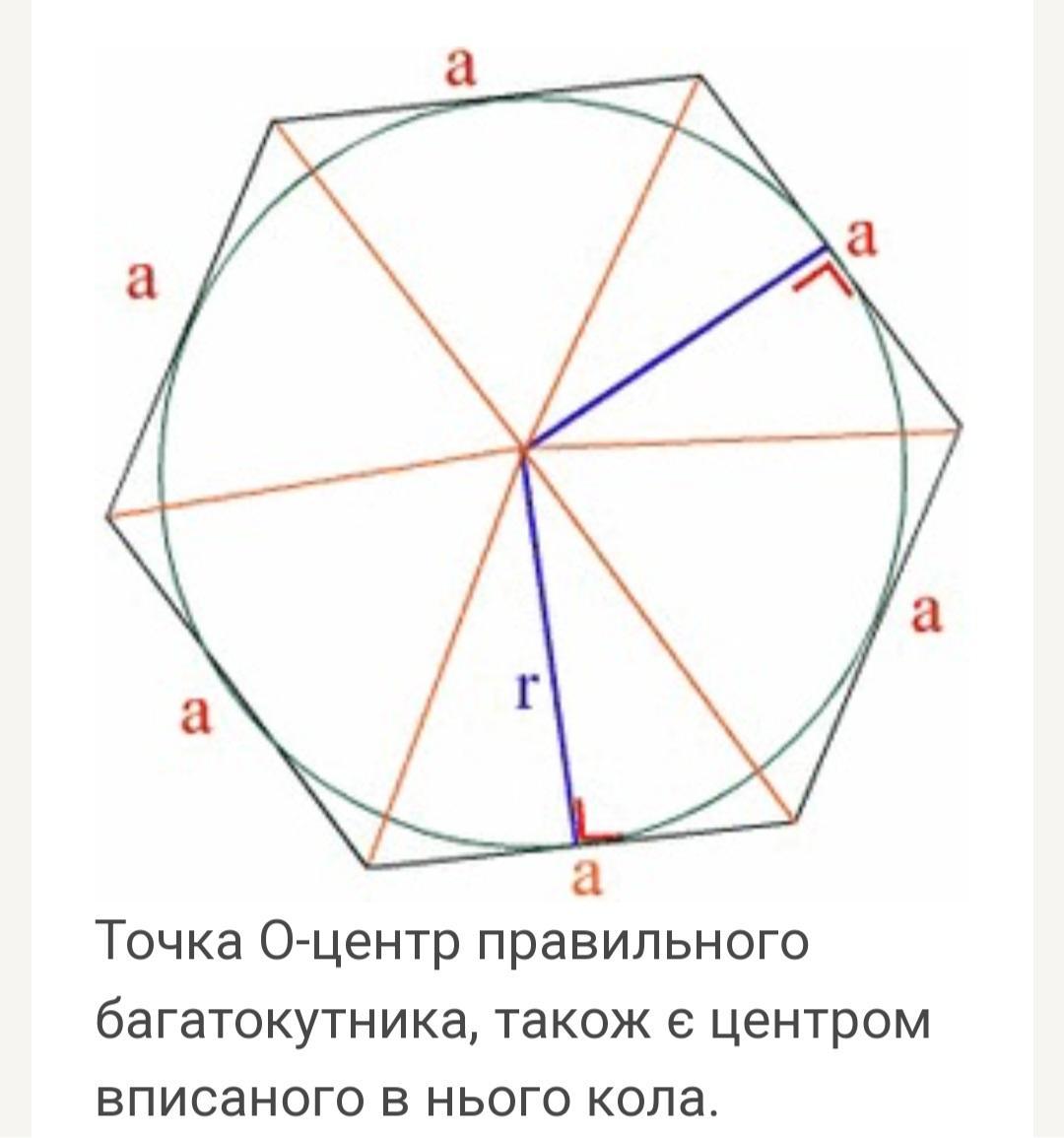 відомий факт — діагоналі правильного шестикутника ділять шестикутник на 6 рівних правильних трикутників, де висота трикутника і є радіусом вписаного в шестикутник коло. Отже, r=а√3/2.