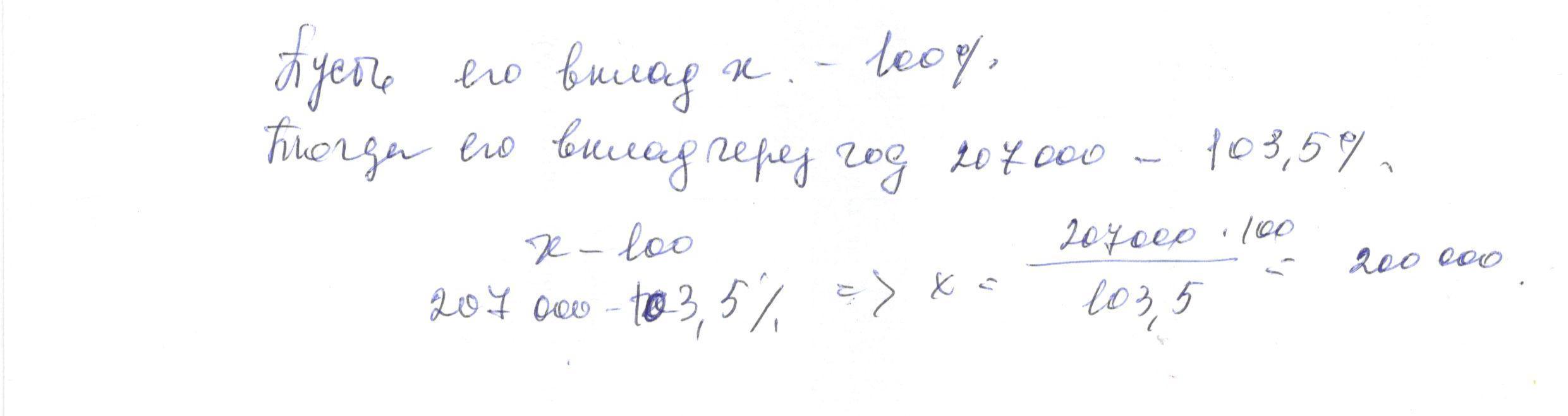 Банк платит вкдадчикам по срочным вкладам 3,5% годовых (т. е. вклад за один год увеличивается на 3,5%). Сколько тенге внес первоначально вкладчик, если через год он получил 207 000 тг?