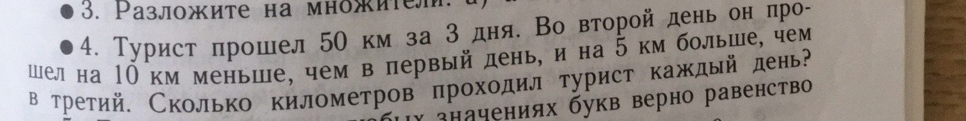 Если х = 25 км принято нами как расстояние, прошедшее туристом в первый день, то (х-10)=(25-10)=15 км — расстояние, пройденное туристом во второй день, и (х-10)-5 =(25-10)-5=10 км — расстояние, пройденное туристом в третий день. Проверка: 25км+15км+10км=50км.