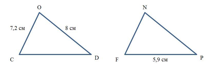 Дано два рiвних трикутники СOD та FNP. Відомо, що CO=7, 2CM, FP = 5,9,