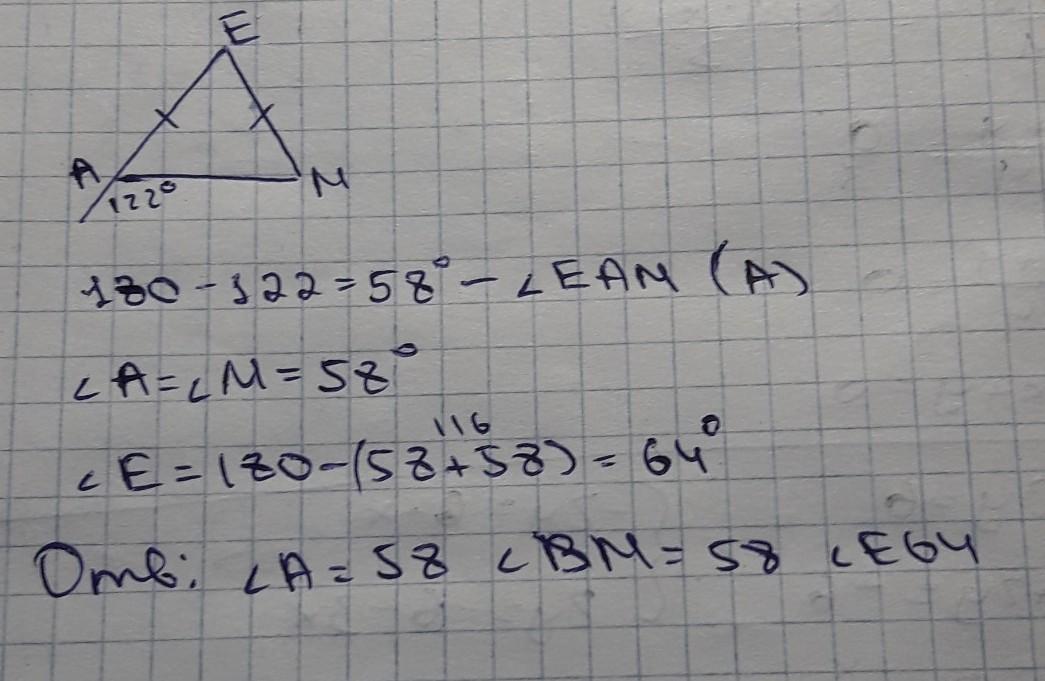 сума двох кутів рівнобедреного трикутника та одного з його зовнішніх кутів дорівнює 258° Знайдіть кути трикутника