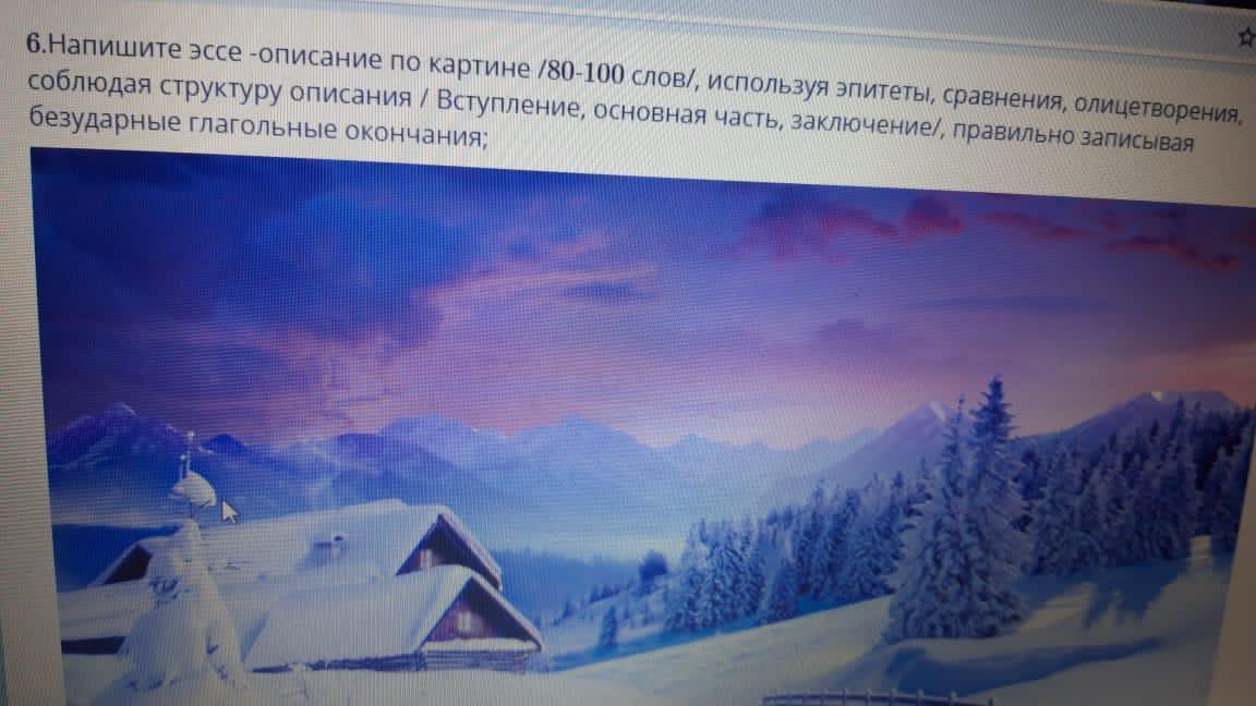 На большей части картины художник изобразил снег. Пушистый, густой, снег лежит везде: на земле, на крышах домов, он почти скрывает под собой небольшие кустики и бурьян на переднем плане. Мне кажется, что Н. П.Крымову важно было подчеркнуть обилие снега, потому что именно снег – это главная примета русской зимы. Художник изобразил зимний вечер на своей картине. На закате снежное пространство уже не блестит, краски приглушены. Солнце скрывается за горизонтом, его последние лучи меняют цвет снега. В тени он синеватый, и его хорошо видно, какой он глубокий и пышный. Там, куда ещё достают солнечные лучи, снег выглядит розоватым. Тропинки, протоптанные в снегу, заметны издали. Их глубина показывает нам, что зима уже вступила в свои права, снег до этого шёл уже довольно долго. В центральной части полотна мы видим картину, привычную для деревенской жизни: люди возвращаются домой, стараясь успеть зайти в жилища до темноты. По узкой тропинке двое взрослых идут с ребёнком в деревню, чуть сзади в том же направлении движется ещё один человек. По дороге в деревню едут двое запряжённых лошадьми саней, на которых нагружены большие копны сена, лошадьми управляет возчик. Фигуры людей не прорисованы чётко, они маленькие и почти бесформенные, потому что люди одеты по-зимнему и расположены не на переднем плане.