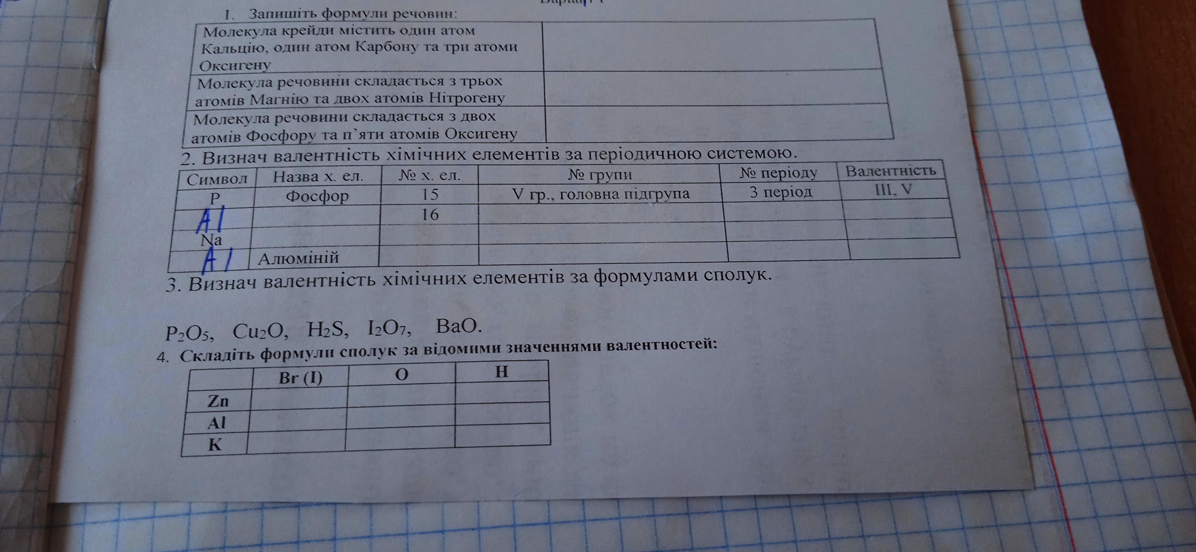 3) Валентності позначай над хімічними символами зверху римськими цифрами: V і II, I і II, I і II, VII і II, II і II