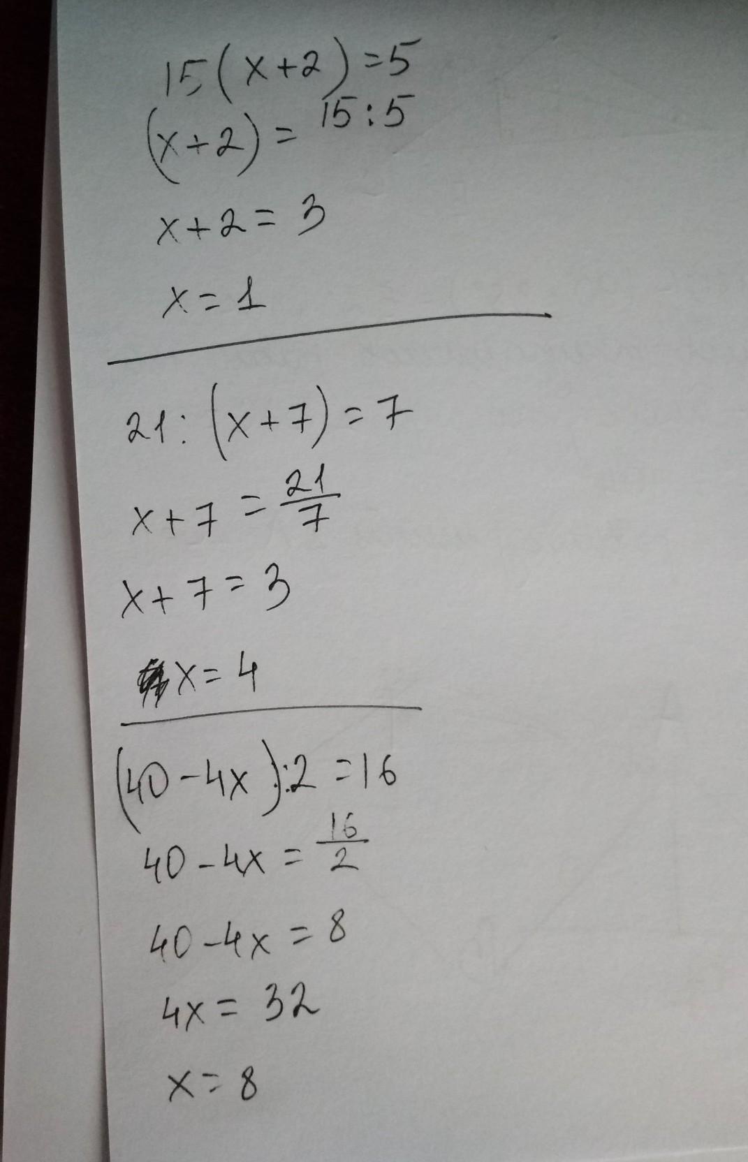Нужна помощь с задачей по Решите пожалуйста, и не удаляйте админы 15:(x+2)=5 21:(x+7)=7 (40-4x):2=16 ? Получите подробные решения и обсуждения от других участников для школьников 5 - 9 класс. Ответы на этот вопрос уже добавлены. Мы приглашаем вас задать свой вопрос и стать экспертом для других.