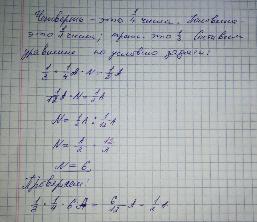 Треть от четверти числа А = А*1/3*1/4 = А/12.