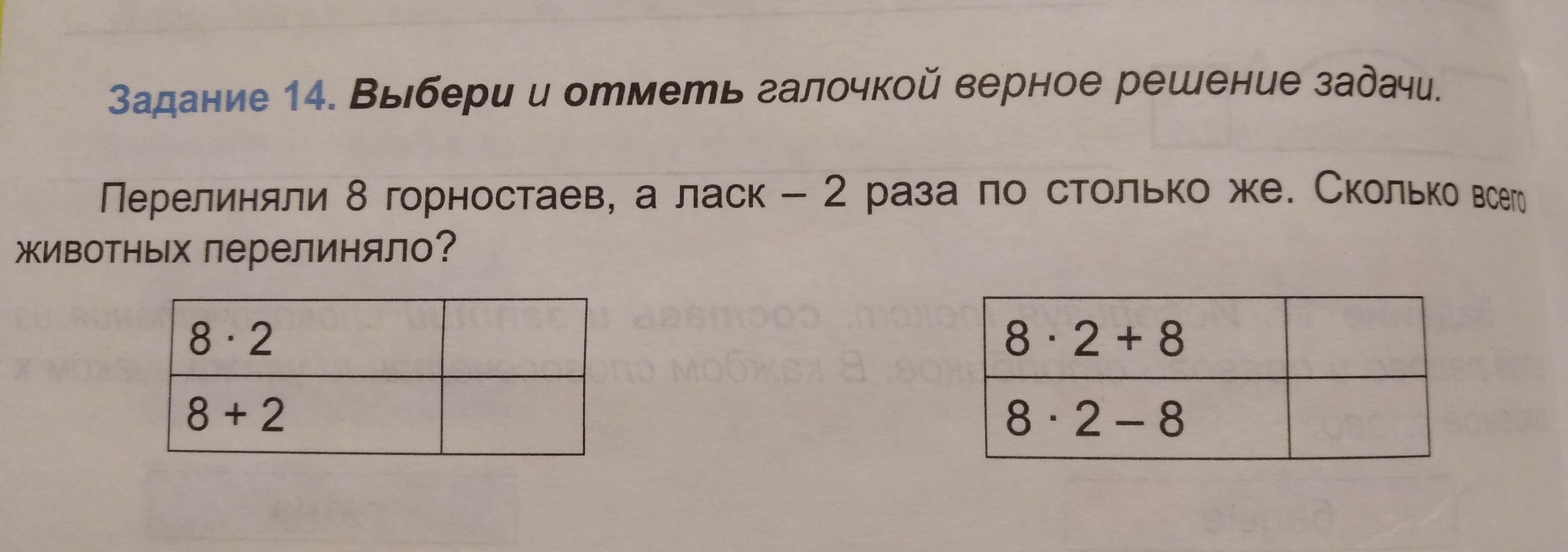 Так как нам нужно узнать сколько животных всего перелиняло, то необходимо сложить количество горностаев 8 (звёрьков по условию) и ласк, число которых нужно найти. Известно, что ласк в два раза больше, чем горностаев, то есть 2*8=16. Затем складываем количество горностаев и ласк, вот и всё