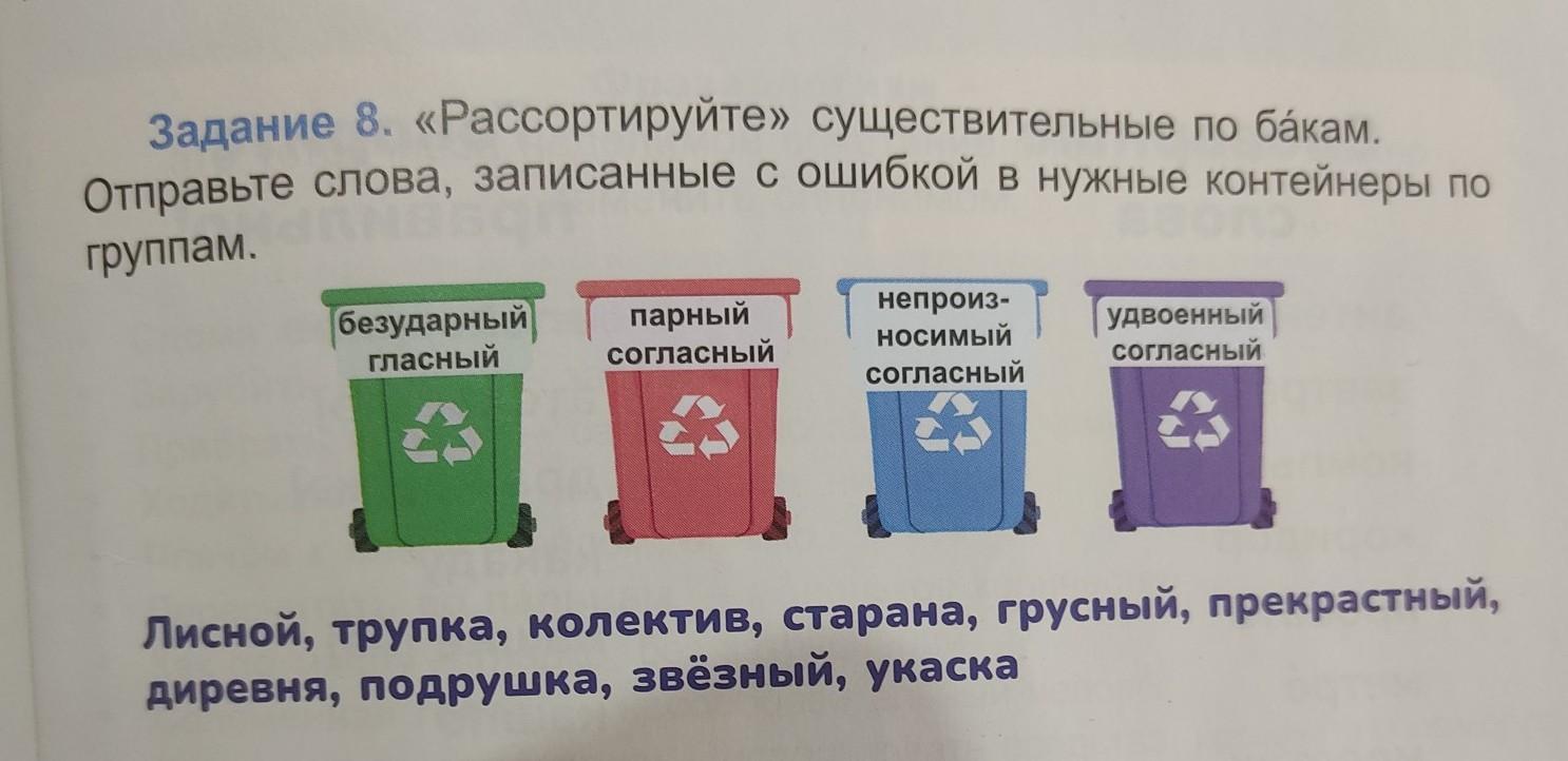 Рассортируйте существительные по бакам. Отправьте слова, записанные с ошибкой, внужные контейнеры по группам.