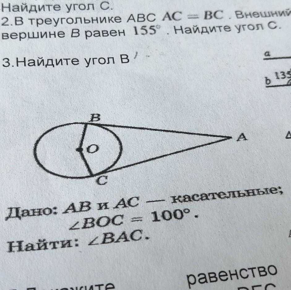 АВСО—четырехугольник=> сумма его углов равна 360° т.к нам известно, что ОВА и ОСА равны 90°, а ВОС=100, то ВАС=360-(90+90+100)=80