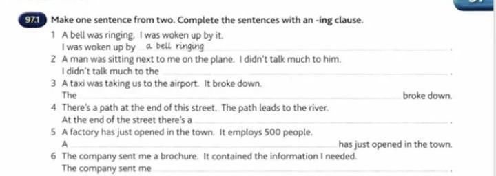nvent) paper? 370. The baby (to cry) last night and we (not to know) how to help it. 371. Though she (to try) not to be late for her classes she always (to turn up) after her teacher. 372. Jack (not to phone) her though she (to wait) for his call the whole morning. 373. Tom knew she (to forgive) him if she (to be) in a good mood. 374. I am glad you (to come back) and now we (to be) together. 375. They (to fight) for freedom and they (to be sure) that they would win it. 376. When I (to open) the door, the teacher (to explain) a new grammar rule. 377. He (to tell) the lecturer she (to choose) her course long before. 378. She (to finish) the translation by Monday. I (to be sure) of that. 379. We (to put up) our tent on the bank of the river when it (to begin) drizzling. 380. Tom (to smile) when he (to understand) the meaning of your words. 381. If 1 (to be free) tomorrow, I (to come) to the club with you. 382. The unusual story I (to hear) (to shock) me. 383. I (to wait) for you at the railway station when the train (to pass) at a terrific speed. 384. By the end of the year they (to construct) a lot of new houses in the town, but we (to need) more.