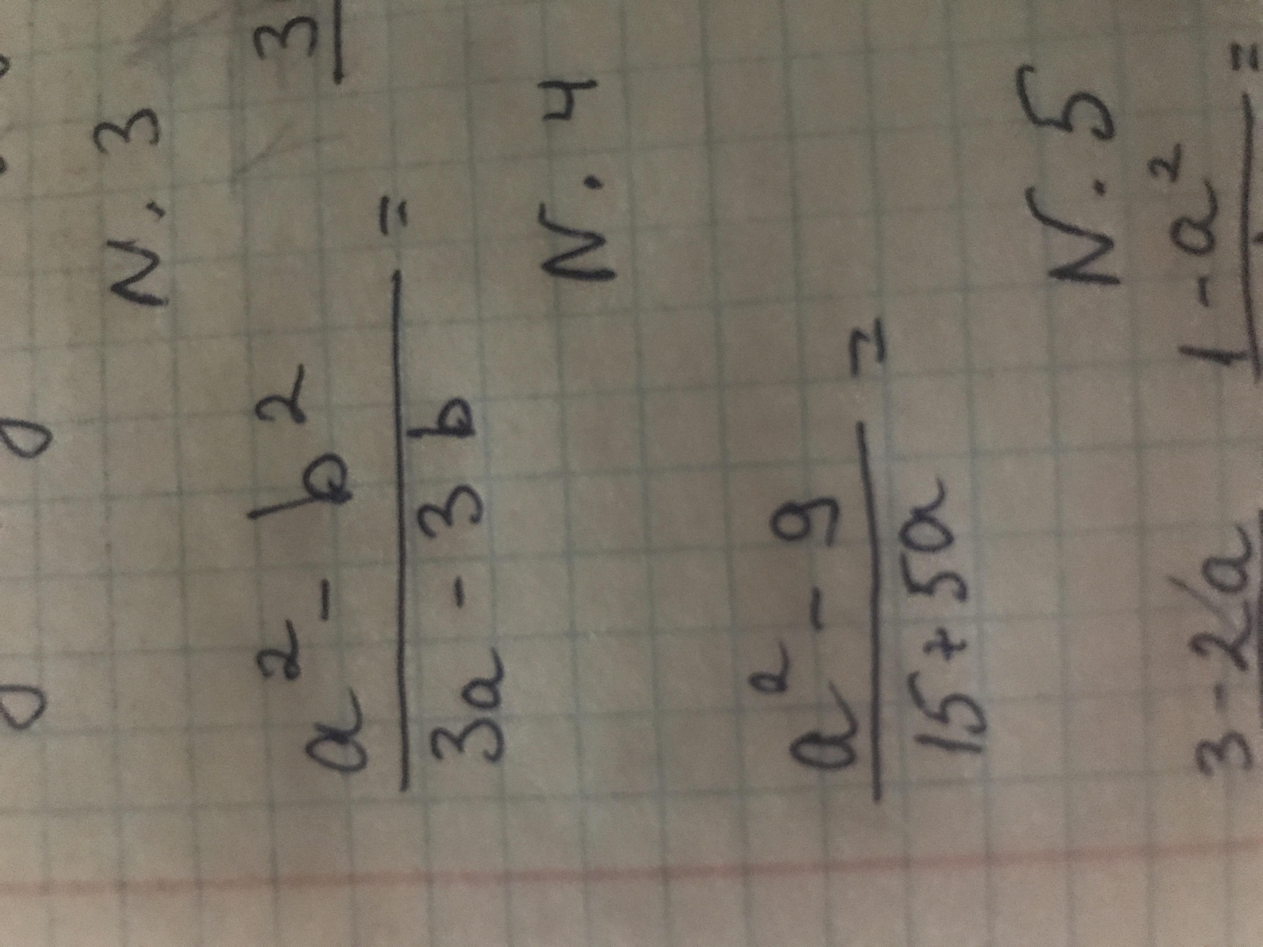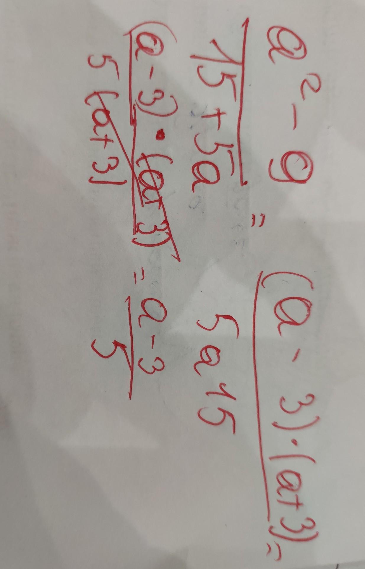a²-9 / 15+5a = (a-3)(a+3) / 5a+15 = (a-3)(a+3) / 5(a+3) = a-3 / 5 (сократили (a+3) )