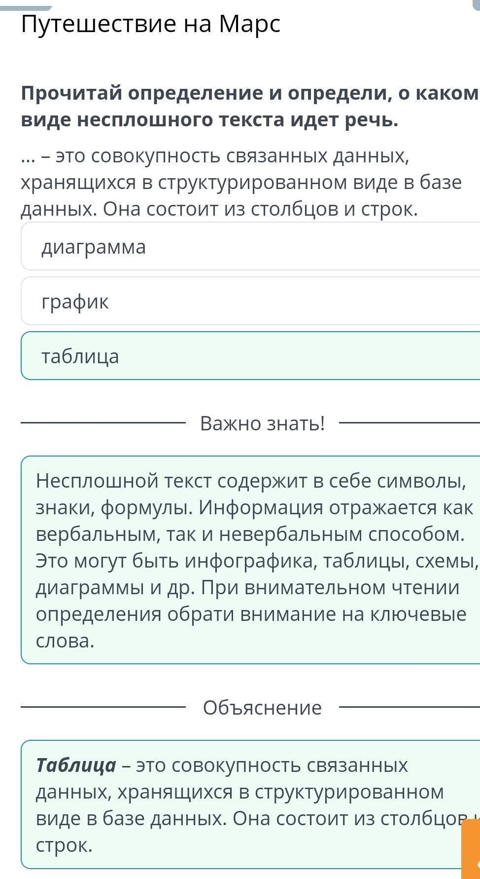 Ответы на задачу по Прочитай определение и определи, о каком виде несплошного текста идет речь. это совокупность связанных данных, хранящихся в структурированном виде в базе данных. Она состоит из столбцов и строк. таблица график диаграмма для школьников 5 - 9 класс. Прочитайте множественные решения и обсудите подходы с участниками. Ответы на этот вопрос уже есть. На нашем сайте вы можете задать свой вопрос и стать частью сообщества экспертов, помогая другим.