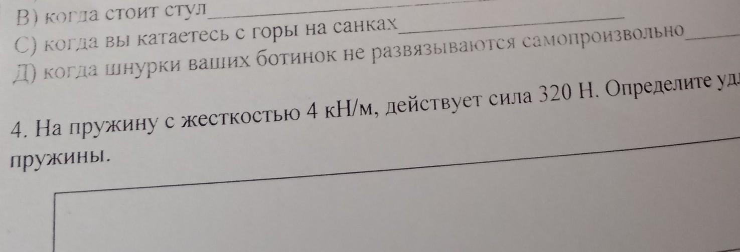 когда стоит стул когда вы катаетесь с горы на санках когда шнурки ваших ботинок не развязываются самопроизвольно На пружину с жесткостью 4 кН/м, действует сила 320 Н. Определите удлинение пружины