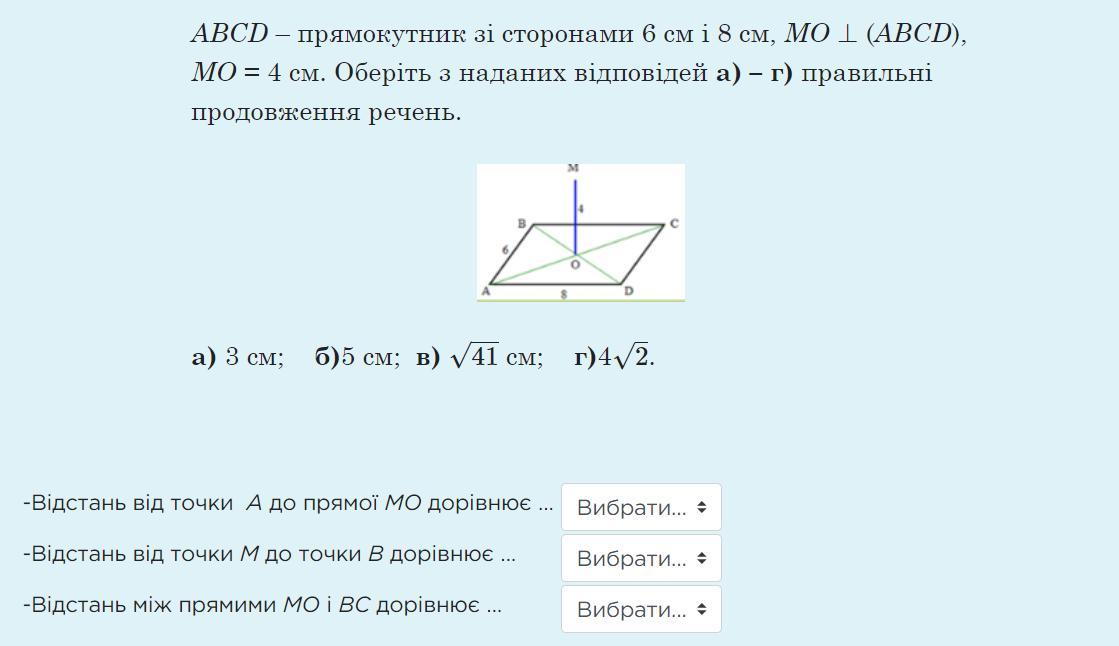 Ищете решение задачи по ABCD – прямокутник зі сторонами 6 см і 8 см, MО ⊥ (ABCD), МО = 4 см. Оберіть з наданих відповідей а) – г) правильні продовження речень.? Узнайте, как решить задачу для школьников 10 - 11 класс, и читайте обсуждения на тему Геометрия. Ответы уже доступны. Задавайте свои вопросы и становитесь частью нашего сообщества экспертов!