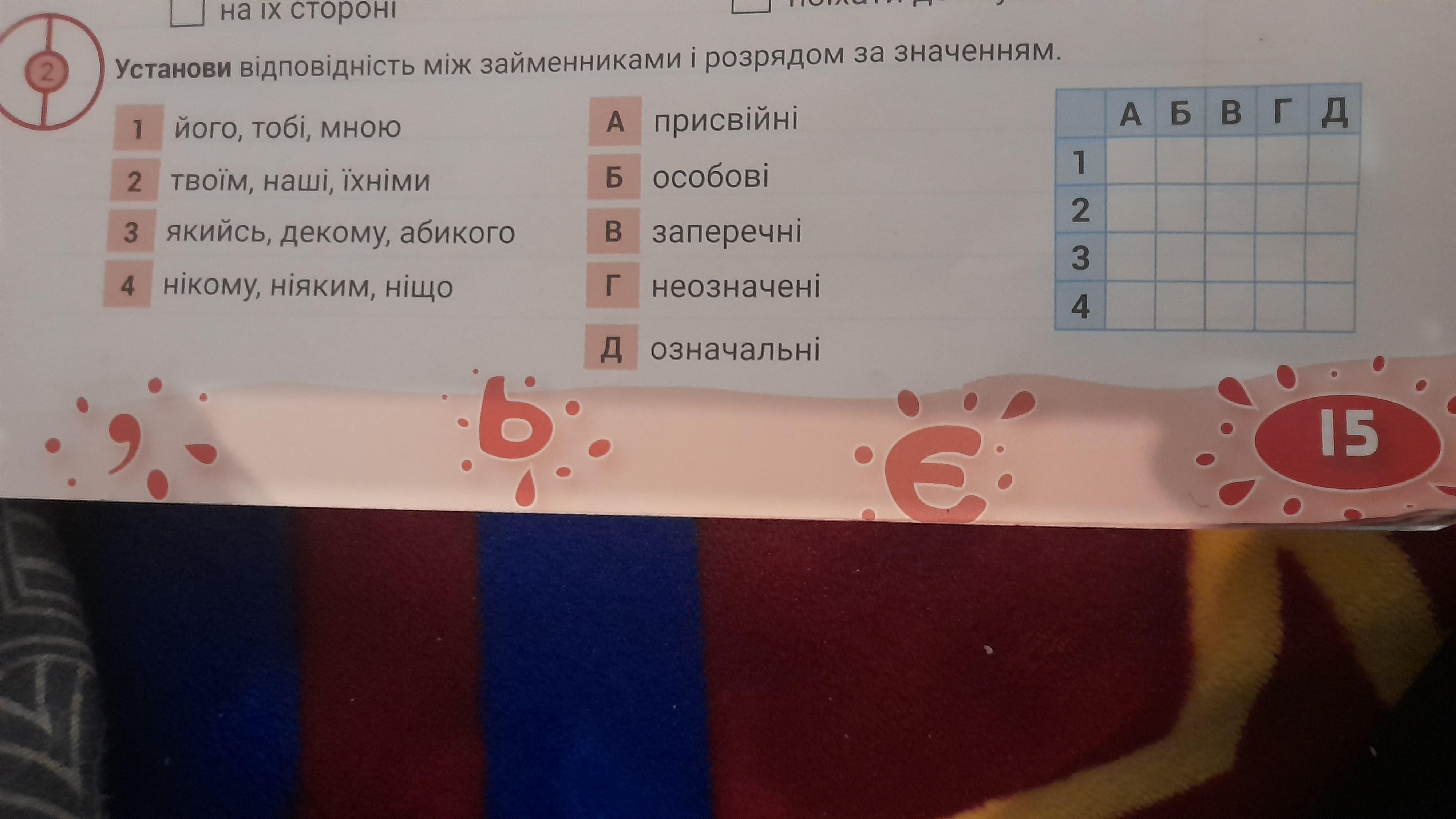 1-Б(особові), 2-А(присвійні), 3-Г(неозначені), 4-В(заперечні)