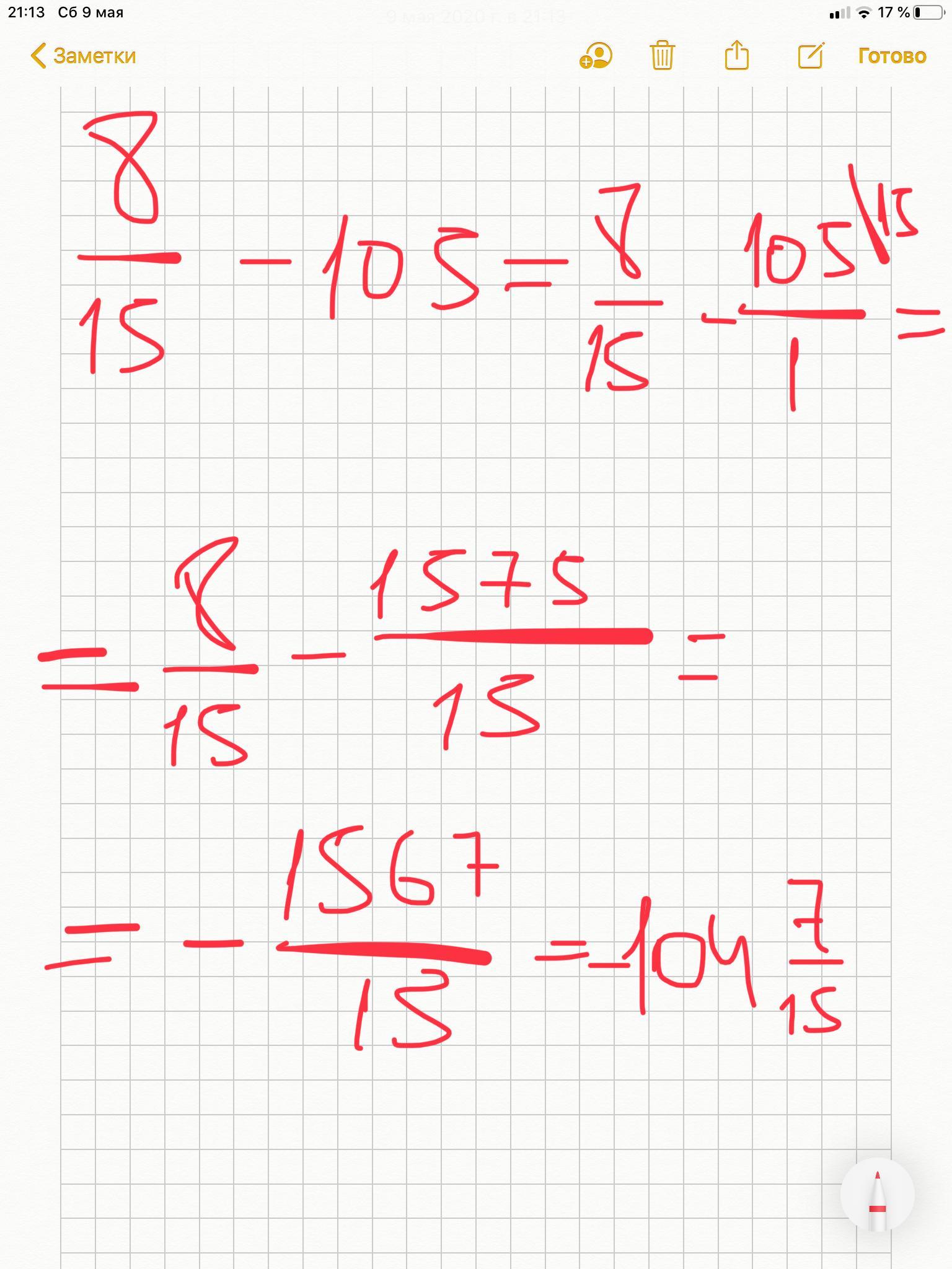 8/15 — 105 = (8 — 105*15)/15=(8-1575)/15=-1567/15=-(104 + 7/15)