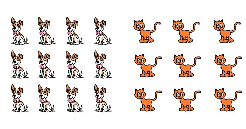 There are 4×3=12 dogs and 3×3=9 cats in this image